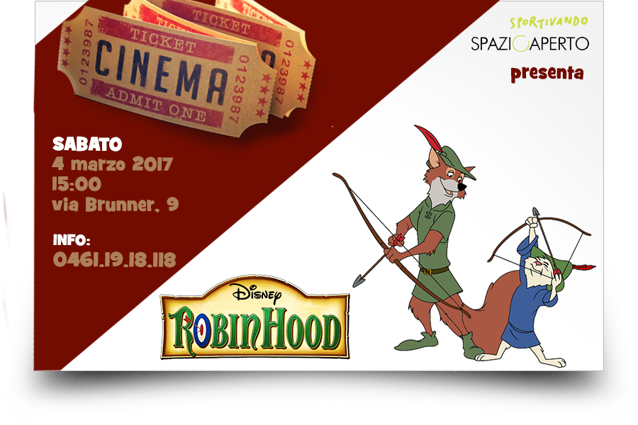 Nuovo appuntamento con il Cineforum di Spazio Aperto, il progetto gratuito di Sportivando. In programma sabato 4 marzo 2016 un grande classico dell'animazione: Robin Hood! L'appuntamento ? alle ore 15.00 presso la sede di via Brunner, 9 a Trento.