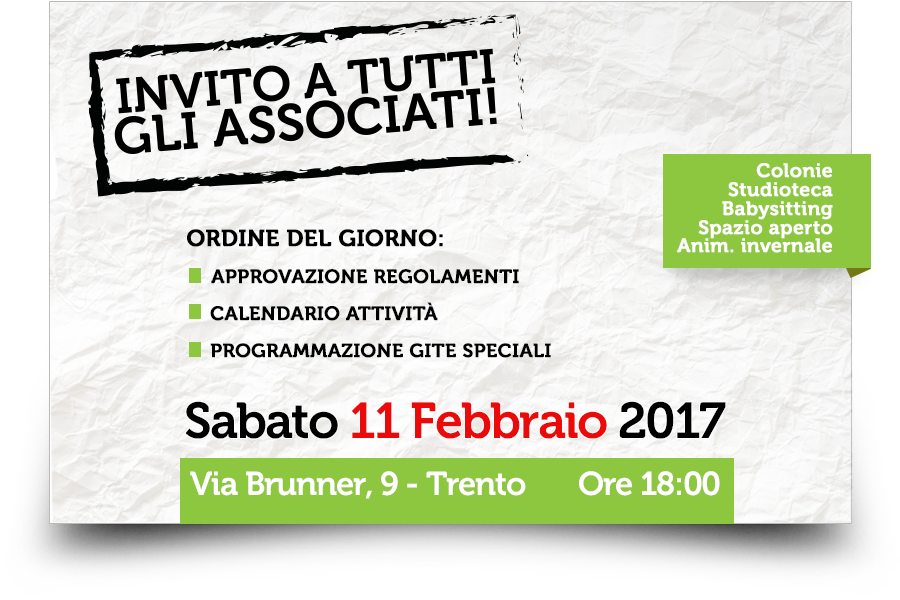 Tutti gli associati sono invitati all'incontro di sabato 11 febbraio 2017, ore 18:00. In questa giornata verranno letti e approvati i regolamenti, valuteremo assieme il calendario delle attività e programmeremo le gite speciali.