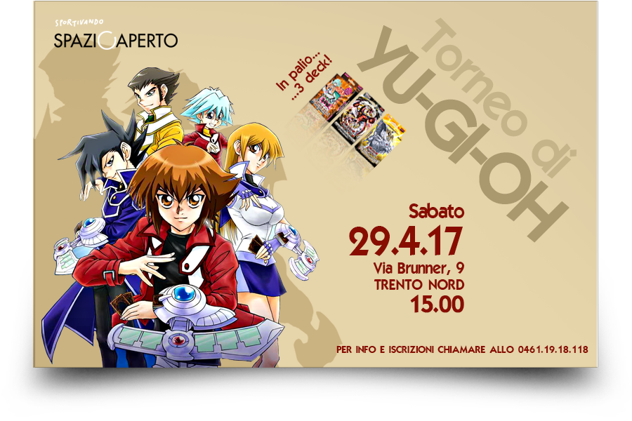 Sfida i tuoi amici nei duelli a colpi di mostri, magie e trappole: sabato 29 Aprile 2017 ti aspettiamo con il tuo deck a Trento, in via Brunner, 9, un deck con tipi di carte quali mostro, magia e trappola per provare a sconfiggere tutti gli appassionati come te della serie Yu-Gi-Oh!