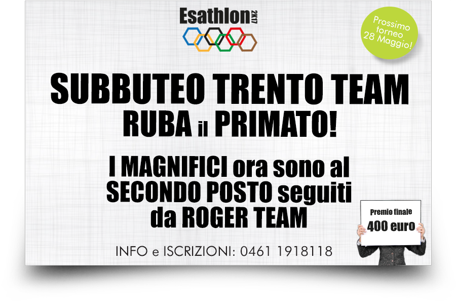 Subbuteo Trento Team ruba il primato! i Magnifici ora sono al secondo posto seguiti da Roger Team. La classifica resterà invariata? Il prossimo torneo si terrà il 28 maggio! Info e iscrizioni: 0461.19.18.118
