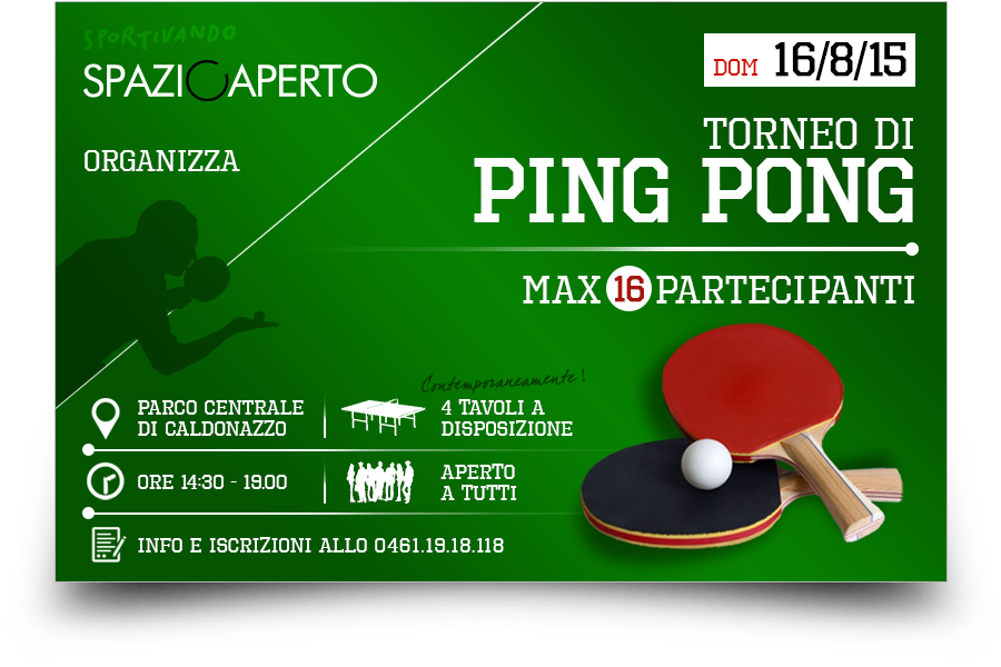 Buongiorno cari soci, vi invito al torneo di ping pong che si terra' il giorno 16 agosto 2015 a partire dalle ore 14.30 presso il prestigioso parco di Caldonazzo. L'iscrizione e' aperta a tutti, soci e conoscenti. Il livello di gioco e' quello dei dilettanti, cioe' non sono ammessi i ...Guarda tutto il testo