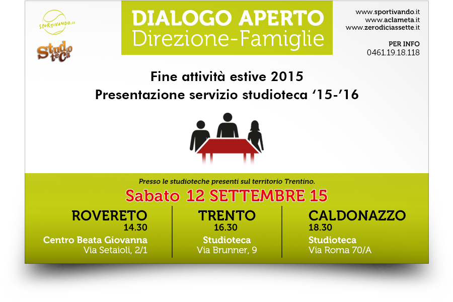 In questo incontro parleremo dell'ottima annata di colonie e dei punti da migliorare e sopratutto verr? focalizzata l'attenzione sul servizio STUDIOTECA. In particolare verranno spiegate i servizi, GRUPPO, INDIVIDUALE, PERSONALIZZATO, le modalit? di approccio, l'organizzazione generale, il refe ...Guarda tutto il testo