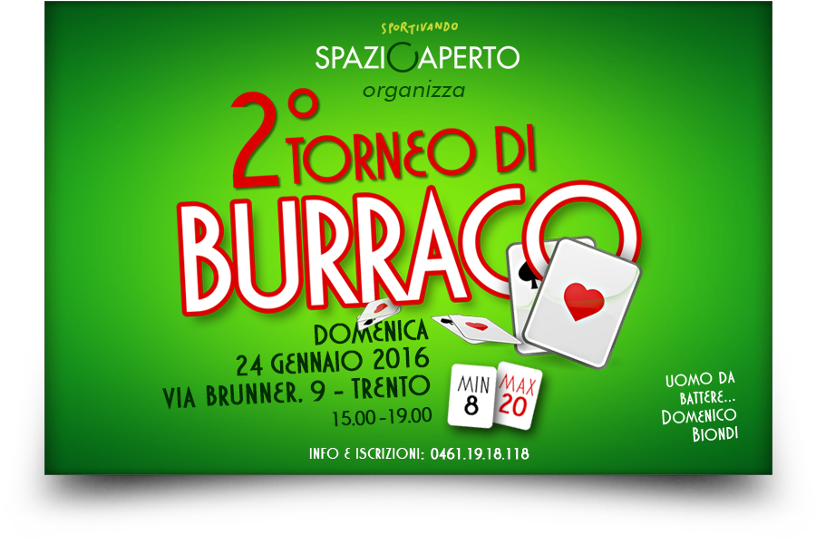 Sei un appassionato del burraco? Domenica 24 gennaio 2016 ad ore 15.00 ti aspettiamo presso la sede di Spazio Aperto in via Brunner, 9 a Trento Nord per un pomeriggio all'insegna di pinelle e pozzetti! Vieni con i tuoi amici, a met? pomeriggio faremo una merenda tutti insieme!