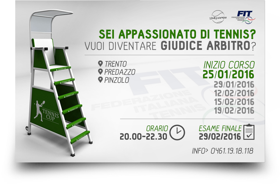 Se ti piace il gioco del tennis, non solo dentro al campo, ma anche da fuori, il corso per giudice arbitro e' quello che fa per te! Dal 25 gennaio e per 5 incontri apprenderai tutto quello che c'e' da sapere per dirigere match e tornei! Per informazioni e' attivo il numero unico 0461.19.18.118.