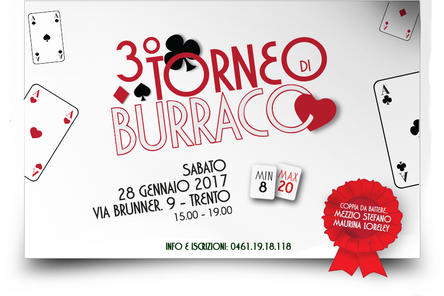 Preparate i vostri mazzetti e fate gioco: sabato 28 gennaio ritorna l'appuntamento in via Brunner 9 con la terza edizione del torneo di Burraco. Siete tutti invitati!