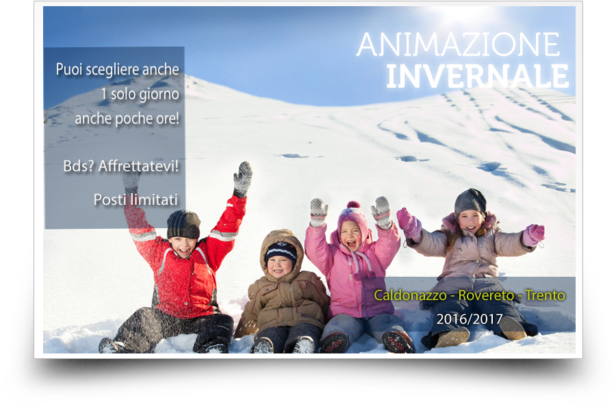 Tornano anche quest'anno le colonie di Natale! Vieni anche tu a divertirti tra gite sulle neve, tuffi in piscina e passeggiate in citta'...non ci sara' tempo per annoiarsi! E puoi prenotare anche solo poche ore! Info e prenotazioni allo 0461.091706.